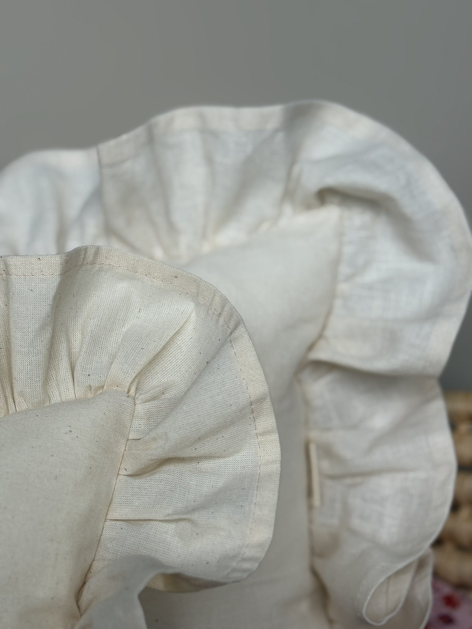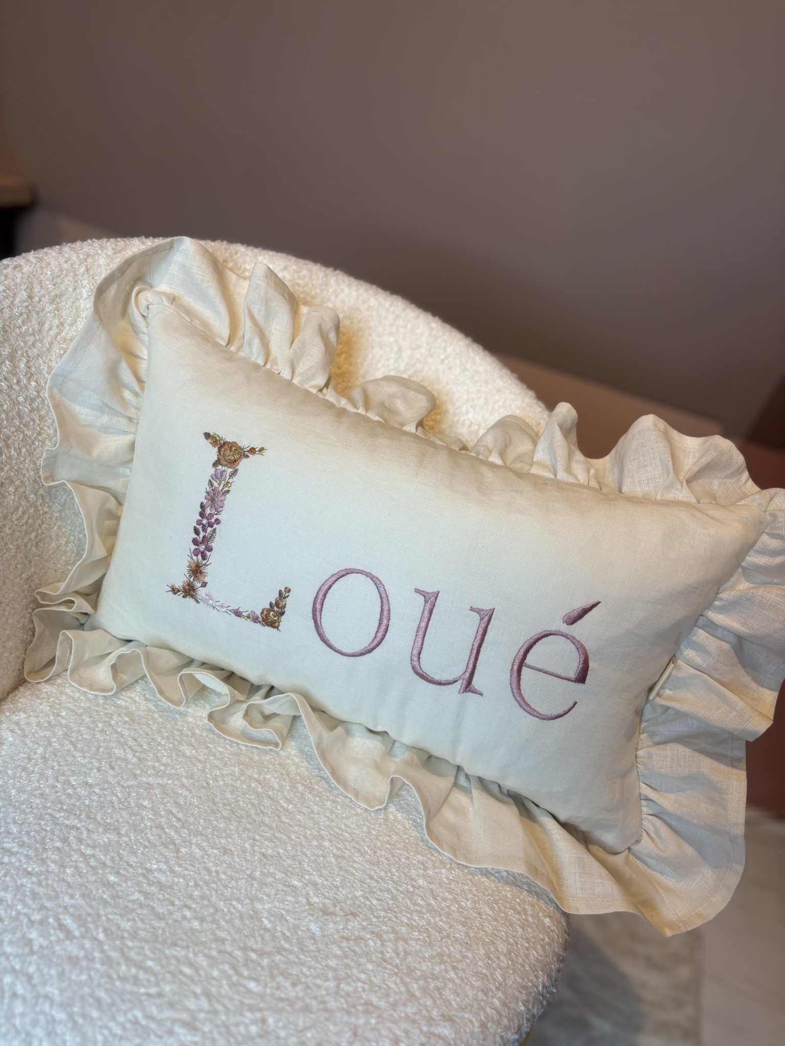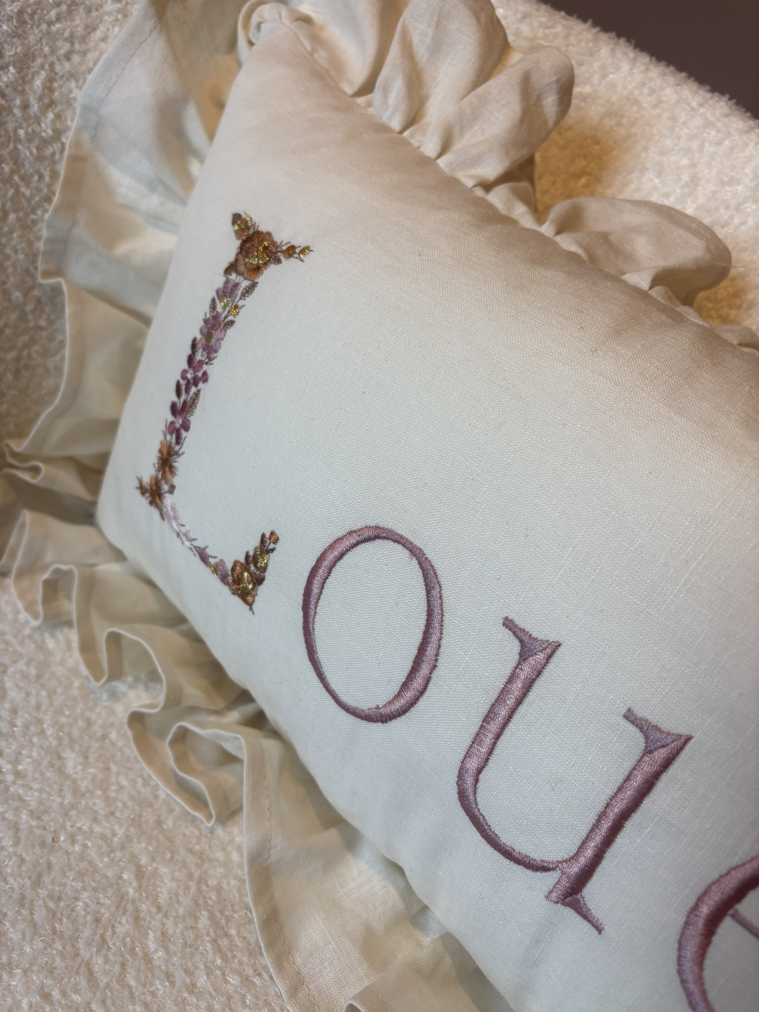 Dit kussen is gemaakt van 100% naturel linnen en heeft een naam met initial borduursel. In de bloemletter zit glitter goud verwerkt en heeft koper met roze tinten. De overige letters zijn in het oud roze.