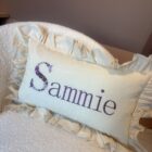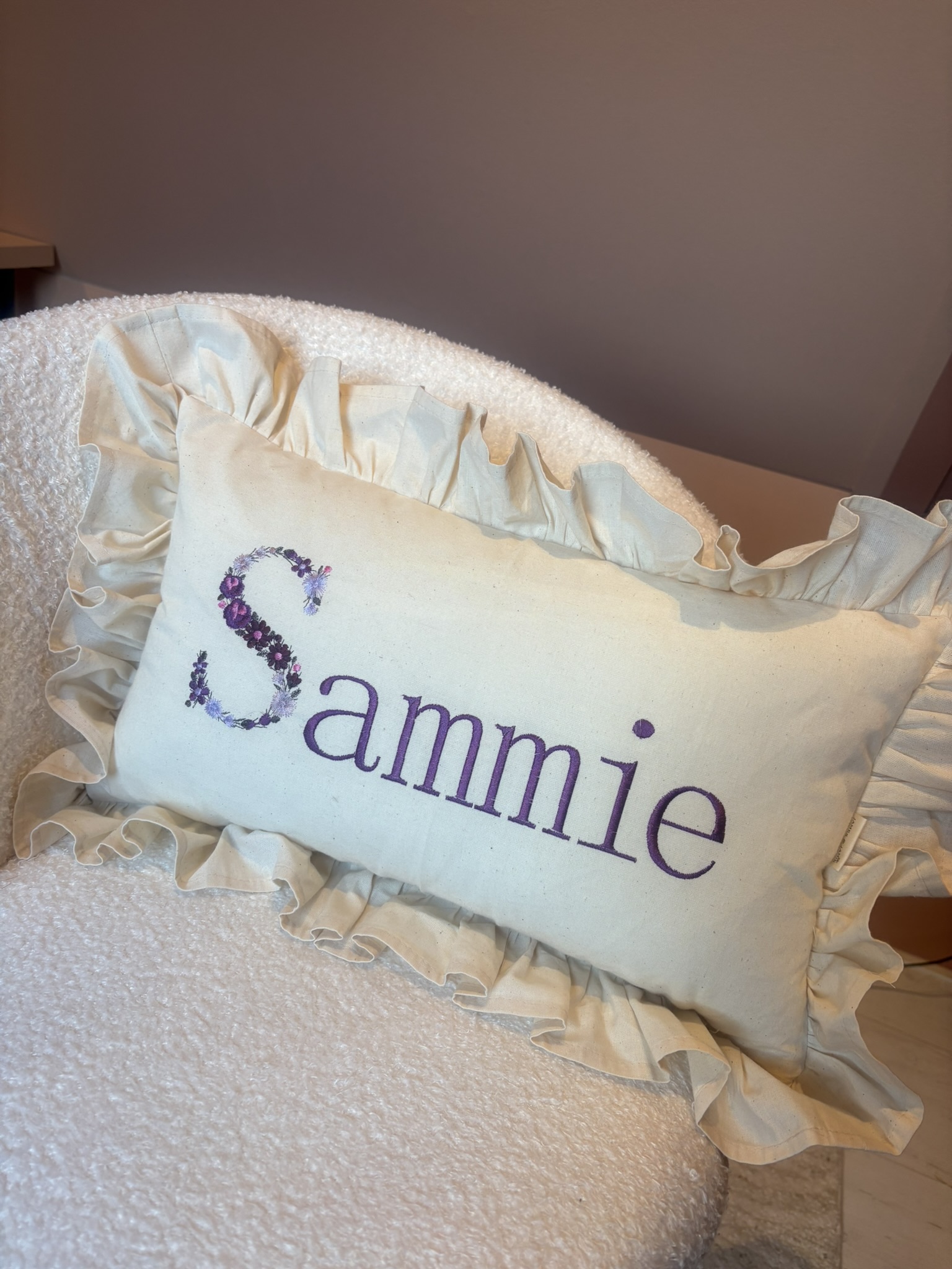 Dit kussen is gemaakt duurzaam en milieuvriendelijk katoen, hierdoor zie je af en toe een ‘katoenpitje’ terug in het kussen. De ruffles maken het helemaal af voor de meisjeskamer en de naam met bloemletter is zeker favoriet. Liever een andere stof of kleurstelling, bekijk dan de andere kussens.